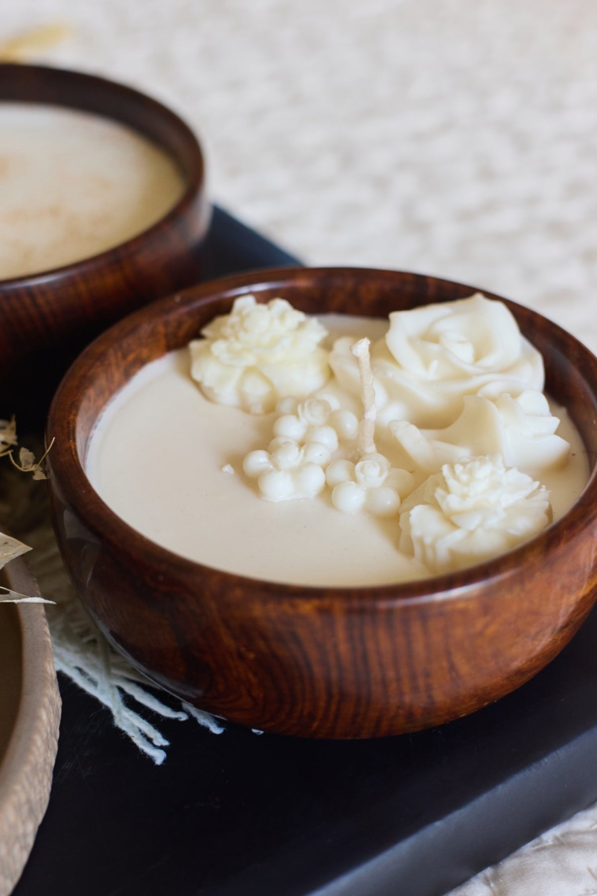 Jasmine Oudh-twist Vanilla candle- Floral Carved top (Brown Rustic Wooden Bowl)